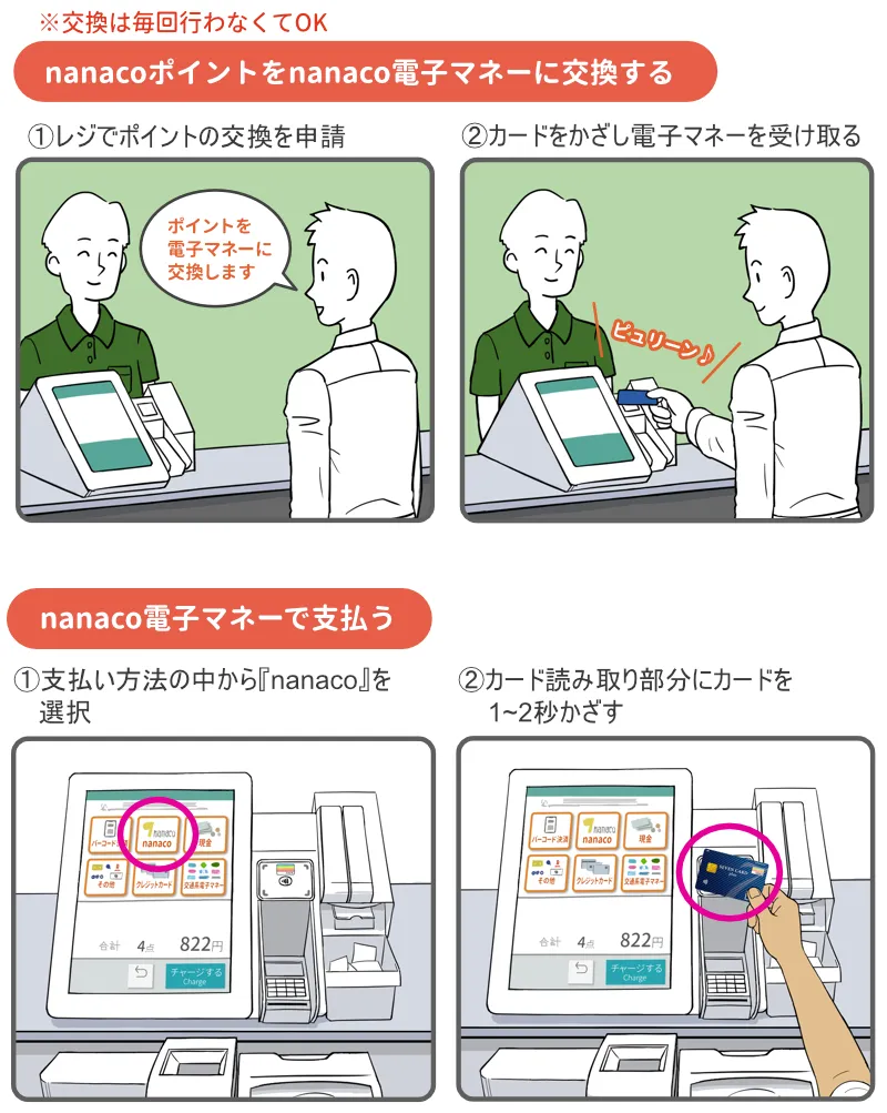セブンカード・プラスで貯まるポイントはnanacoポイント。nanaco一体型セブンカード・プラスを選べば、支払い方法で『nanaco』を選び、同じセブンカードをかざすだけでOKだ。